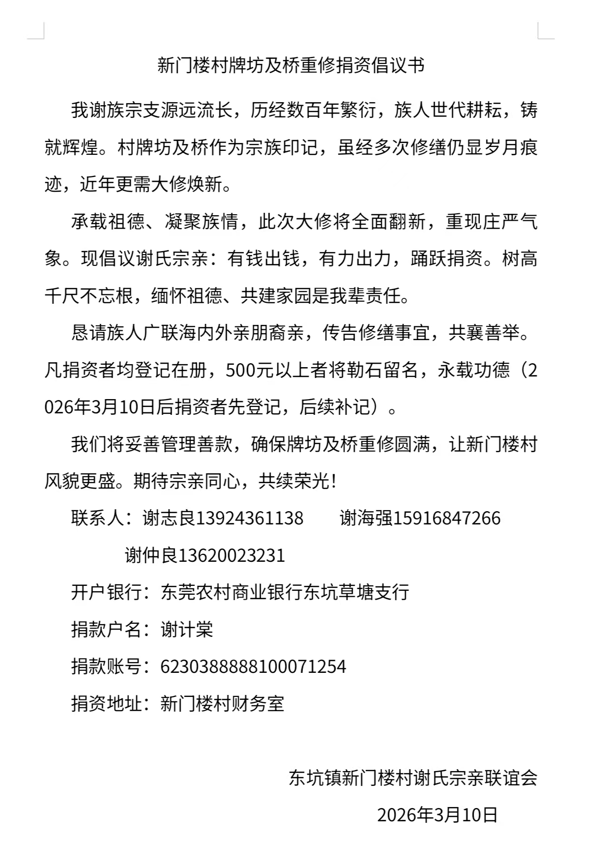恳请族人广联海内外亲朋裔亲,传告修缮事宜,共襄善举。凡捐资者均登记在册,500元以上者将勒石留名,永载功德(2026年3月10日后捐资者先登记,后续补记).